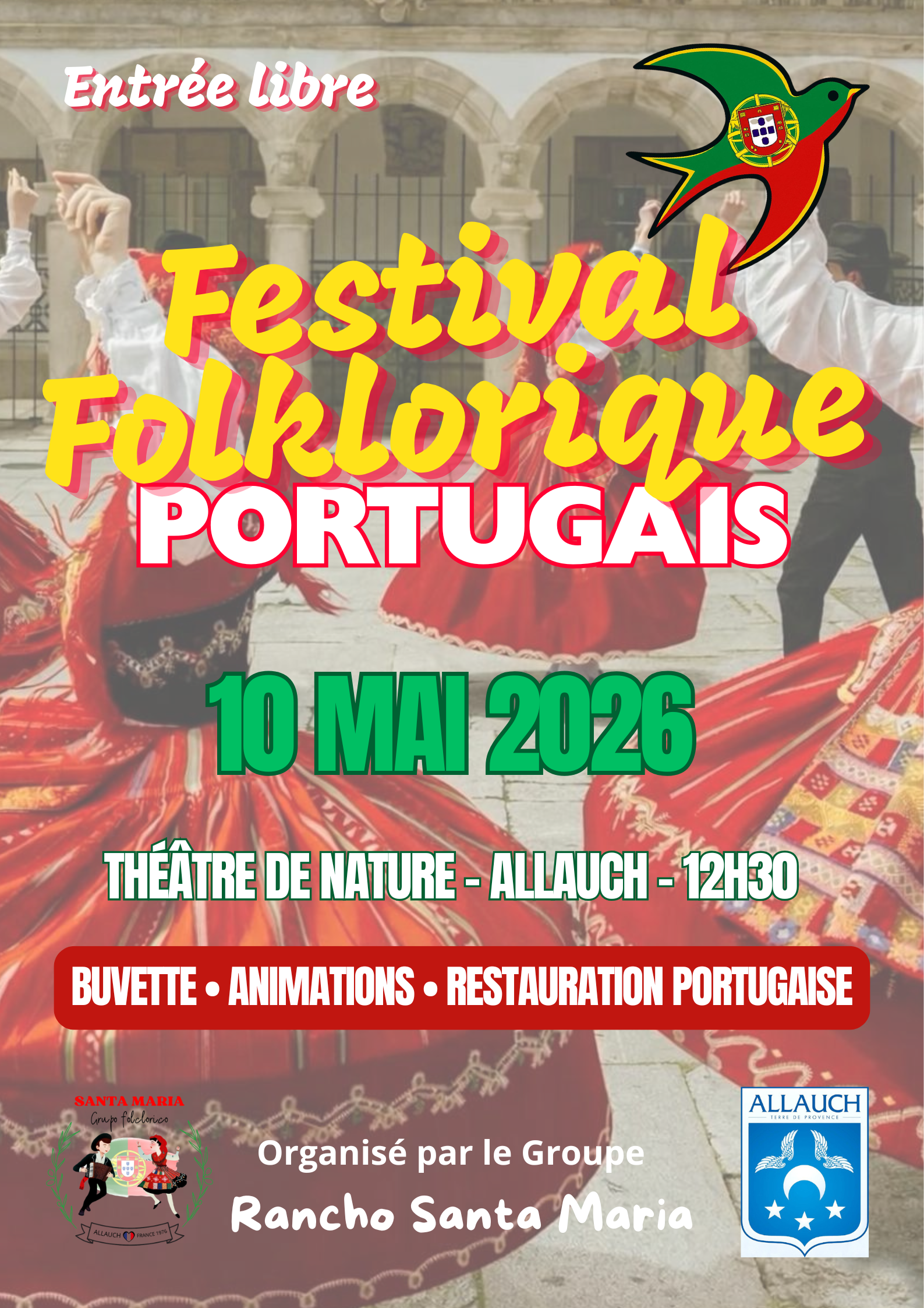 Le festival folklorique portugais se déroulera à Allauch le 10 mai 2026. La journée débutera à 10h30 par une messe en l'honneur de Nossa Senhora de Fátima à l'Eglise St. Sébastien Allauch Village, suivie à 11h30 par le départ de la procession. À 12h00, une restauration rapide sera proposée, accompagnée d'une animation par Arsénio Gomes au Théâtre de Nature, avec entrée libre. Le festival débutera officiellement à 14h30, avec la participation de l'AFPM Rancho de Monaco, Juventude Lusitana de Toulon, Leis Ami d'Alau et Rancho Santa Maria d'Allauch.