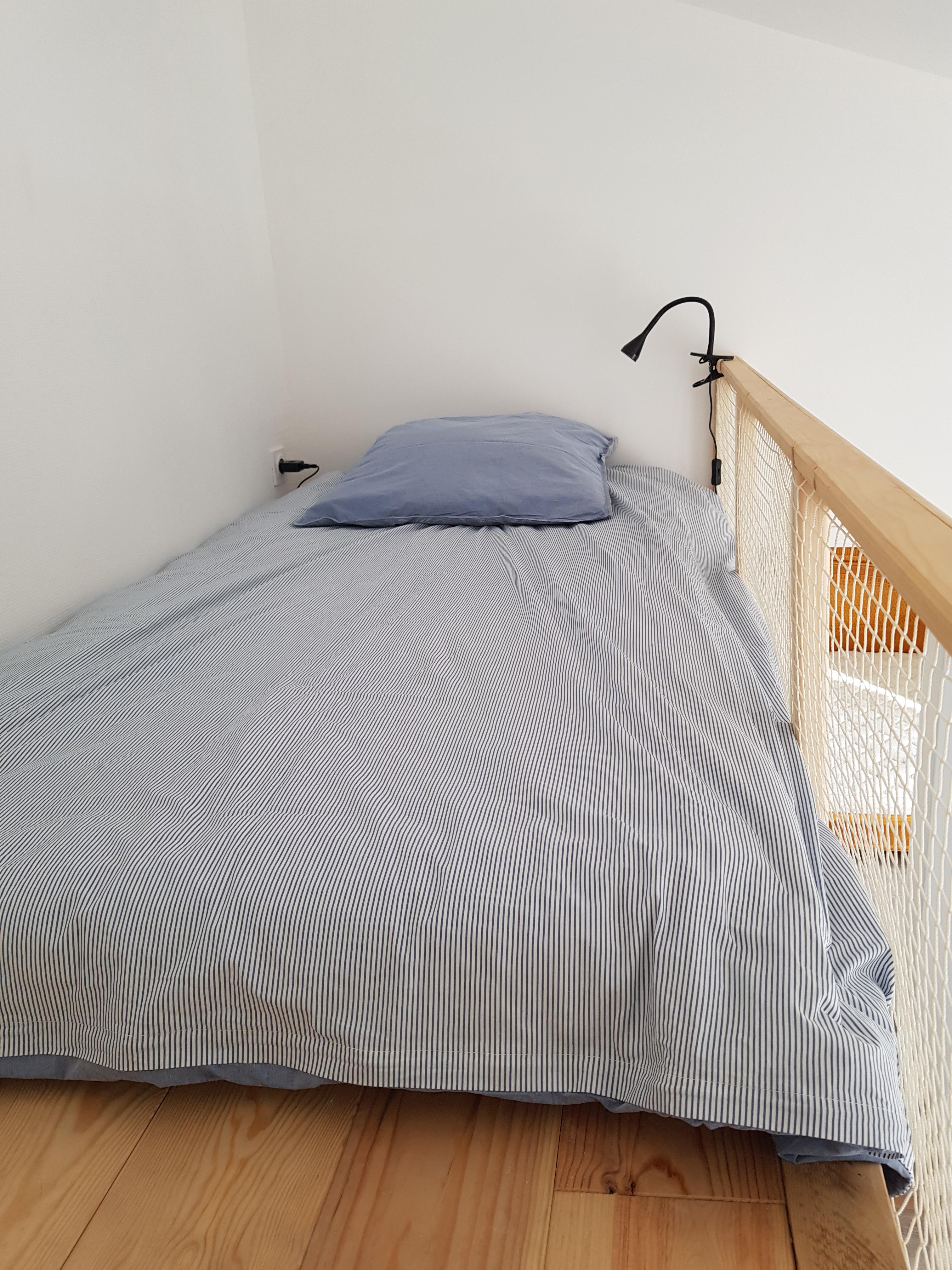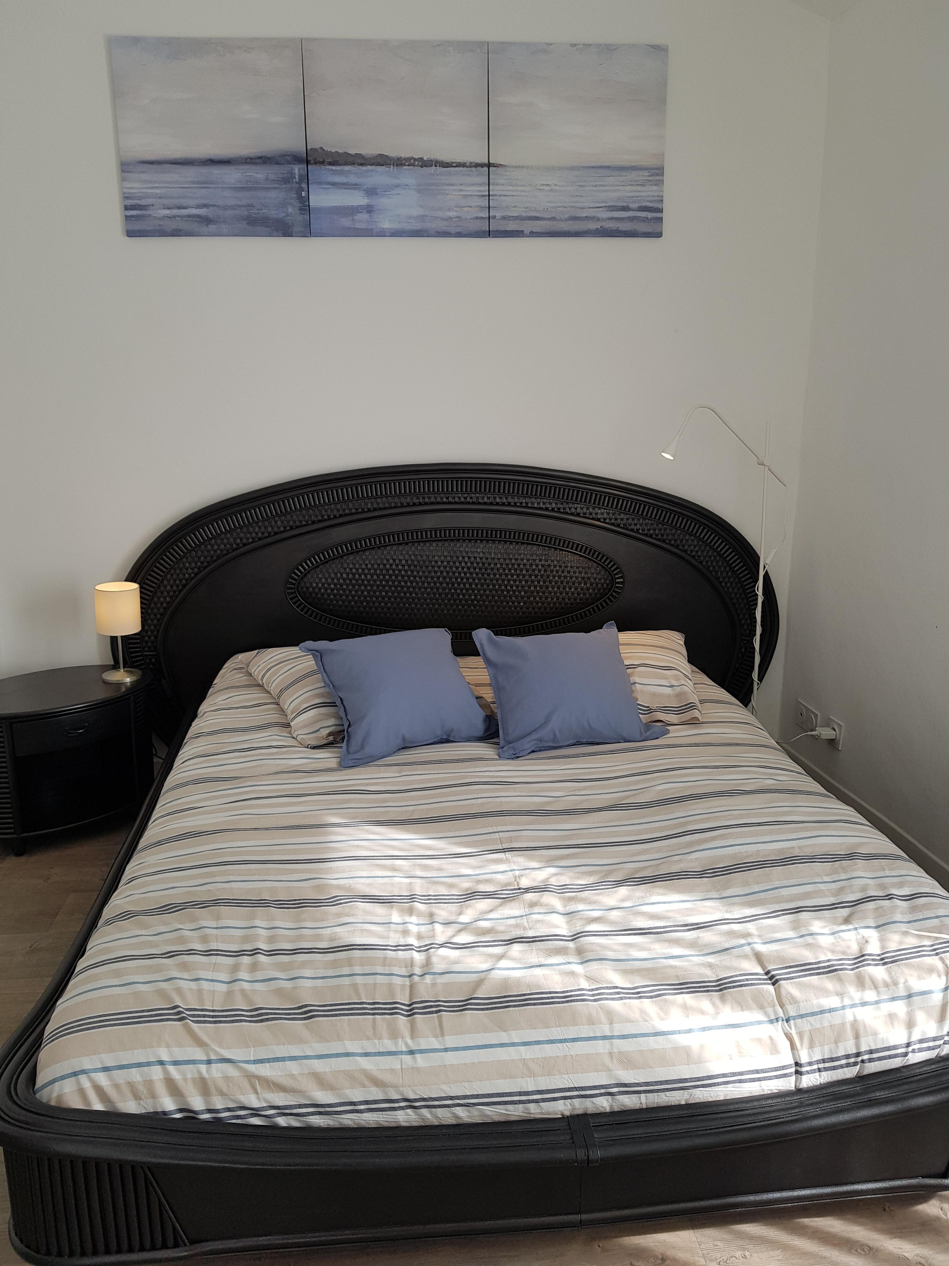 1 chambre avec un lit double en 160 + ventilateur au plafond + placard et accès au balcon avec toit végétalisé.
