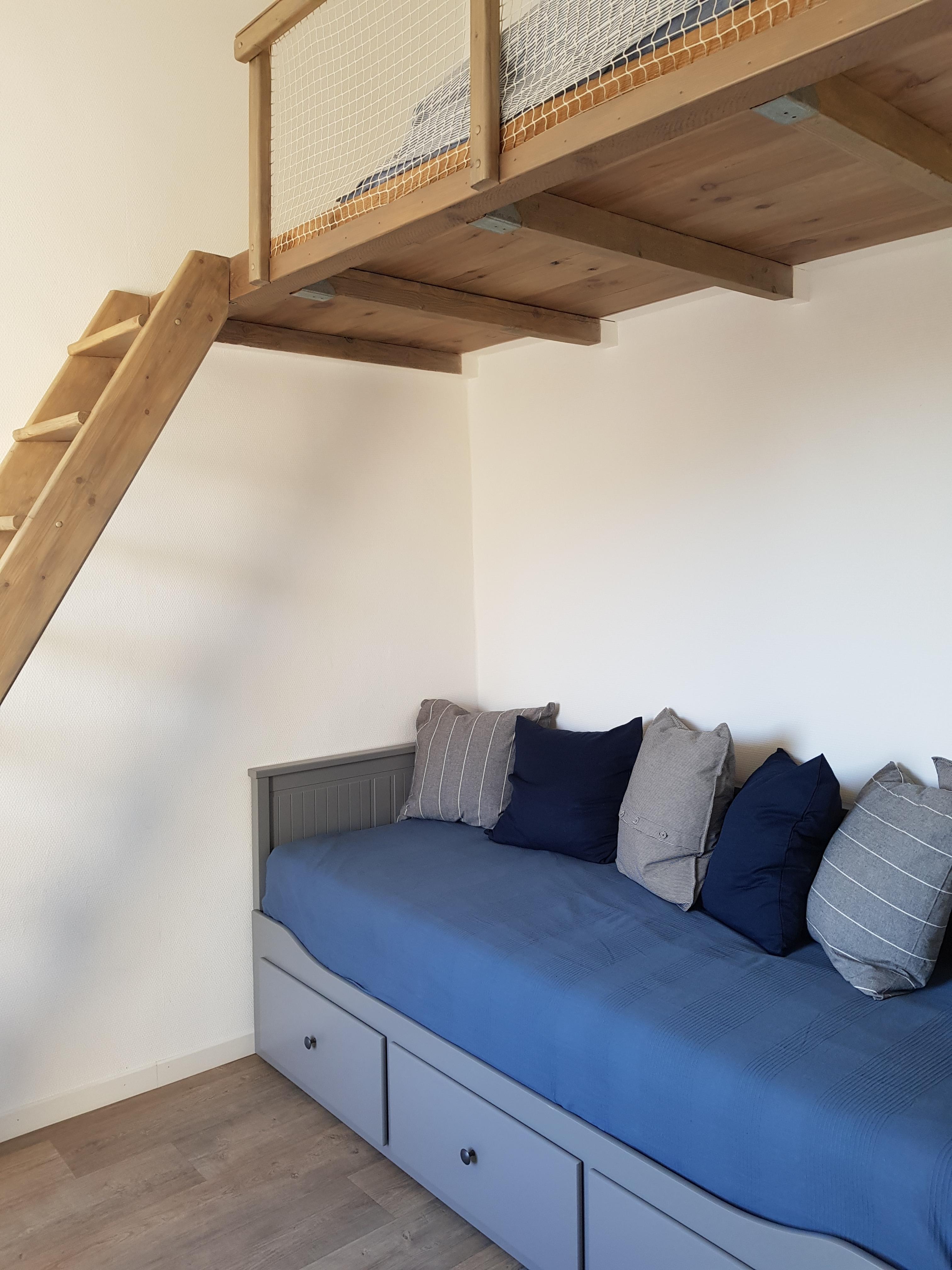 1 chambre avec lit gigogne 1 ou 2 personnes au choix + 1 lit 1 personne sur mezzanine + ventilateur sur pied + 1 bureau.