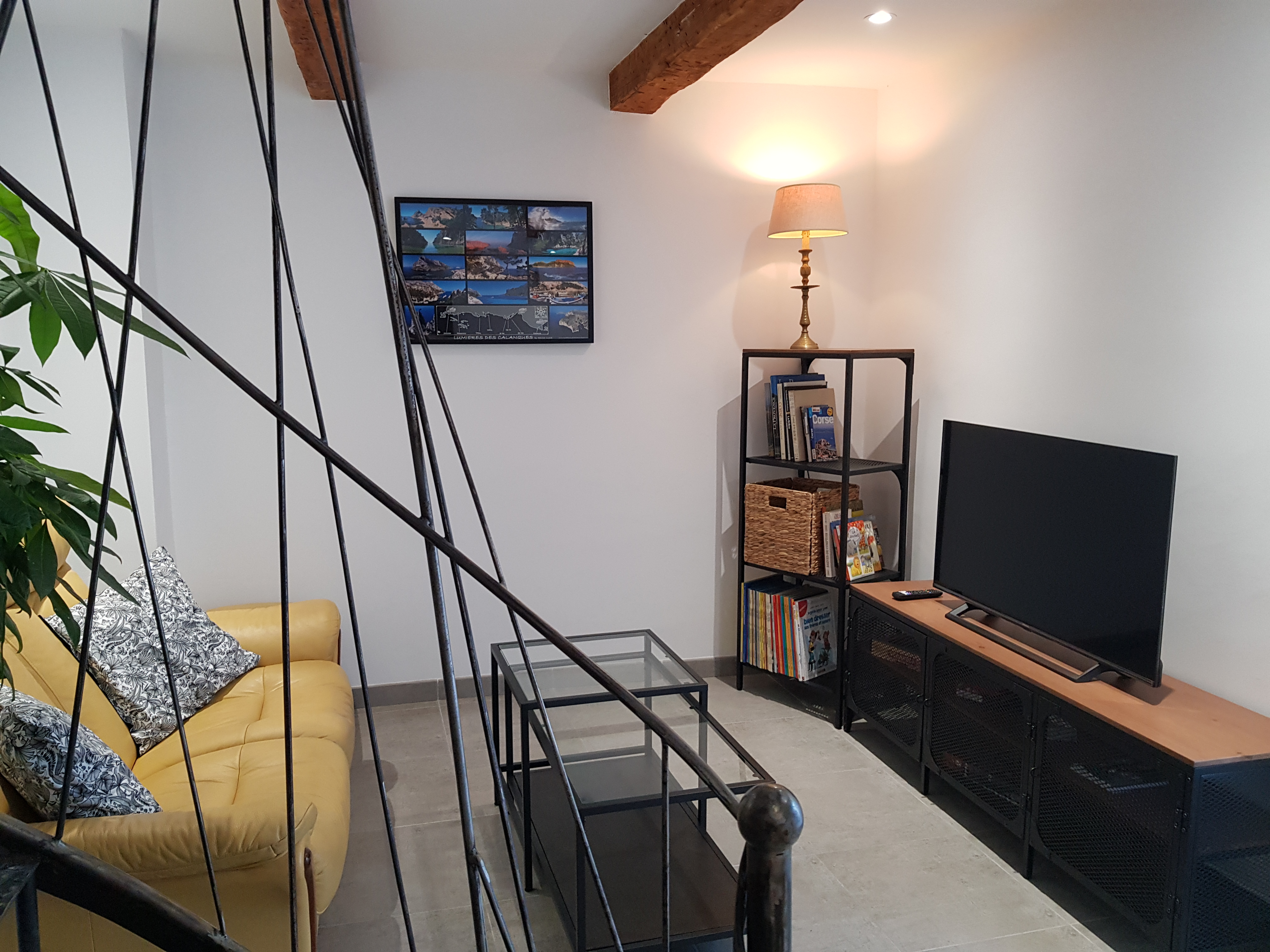 Salon avec téléviseur, livres et jeux de société.