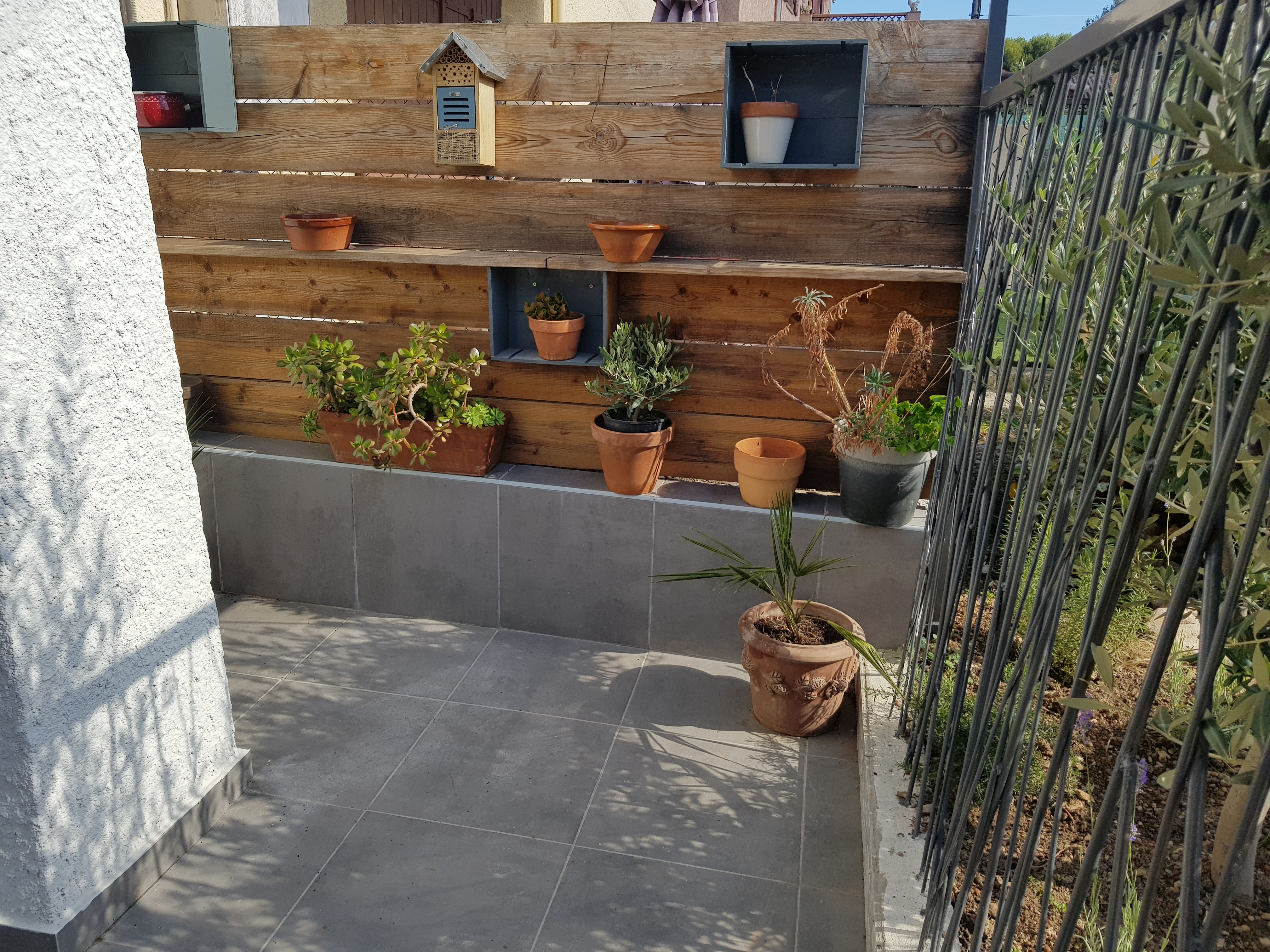 Cour végétalisée avec table, chaises et parasol.
