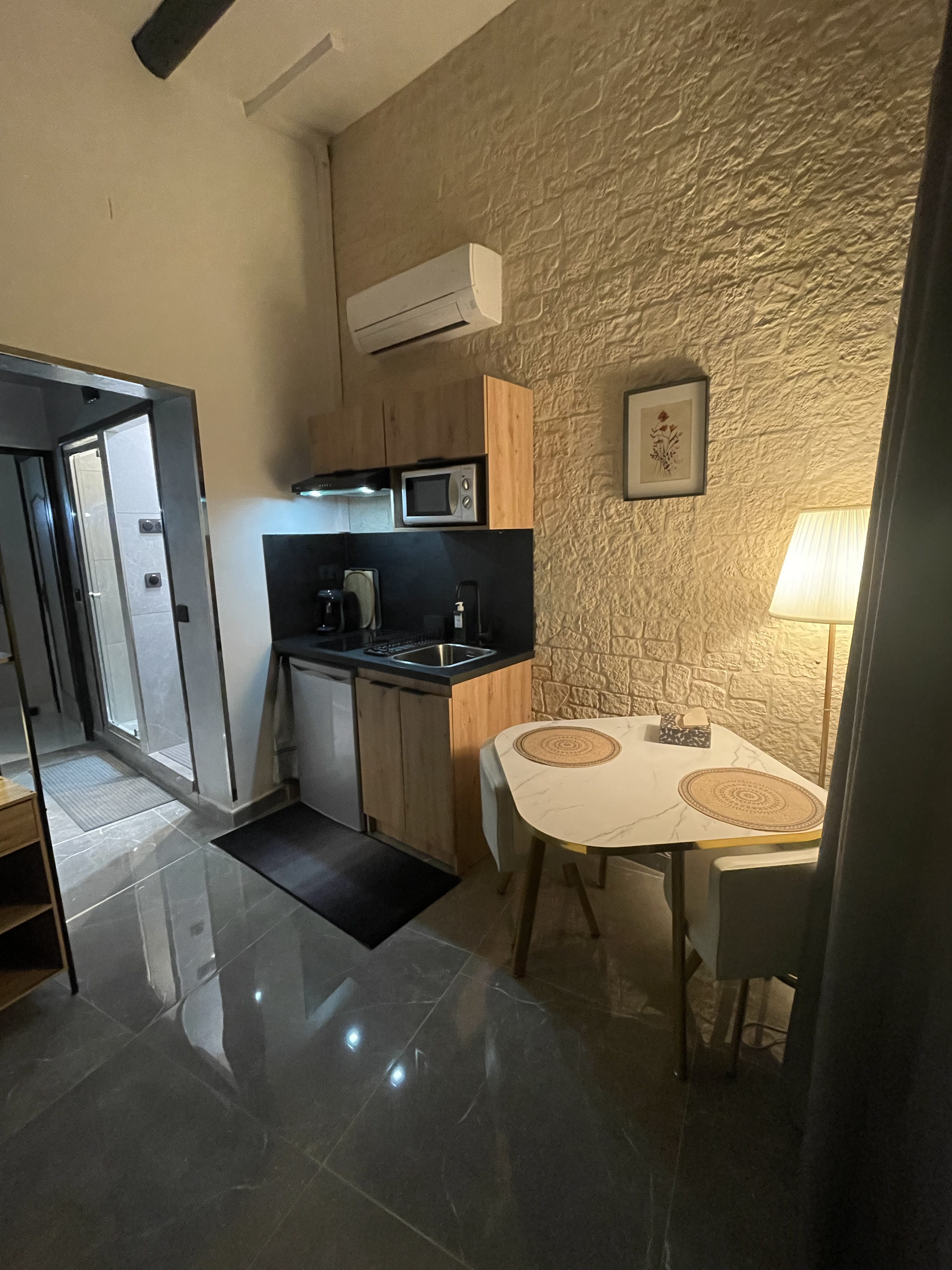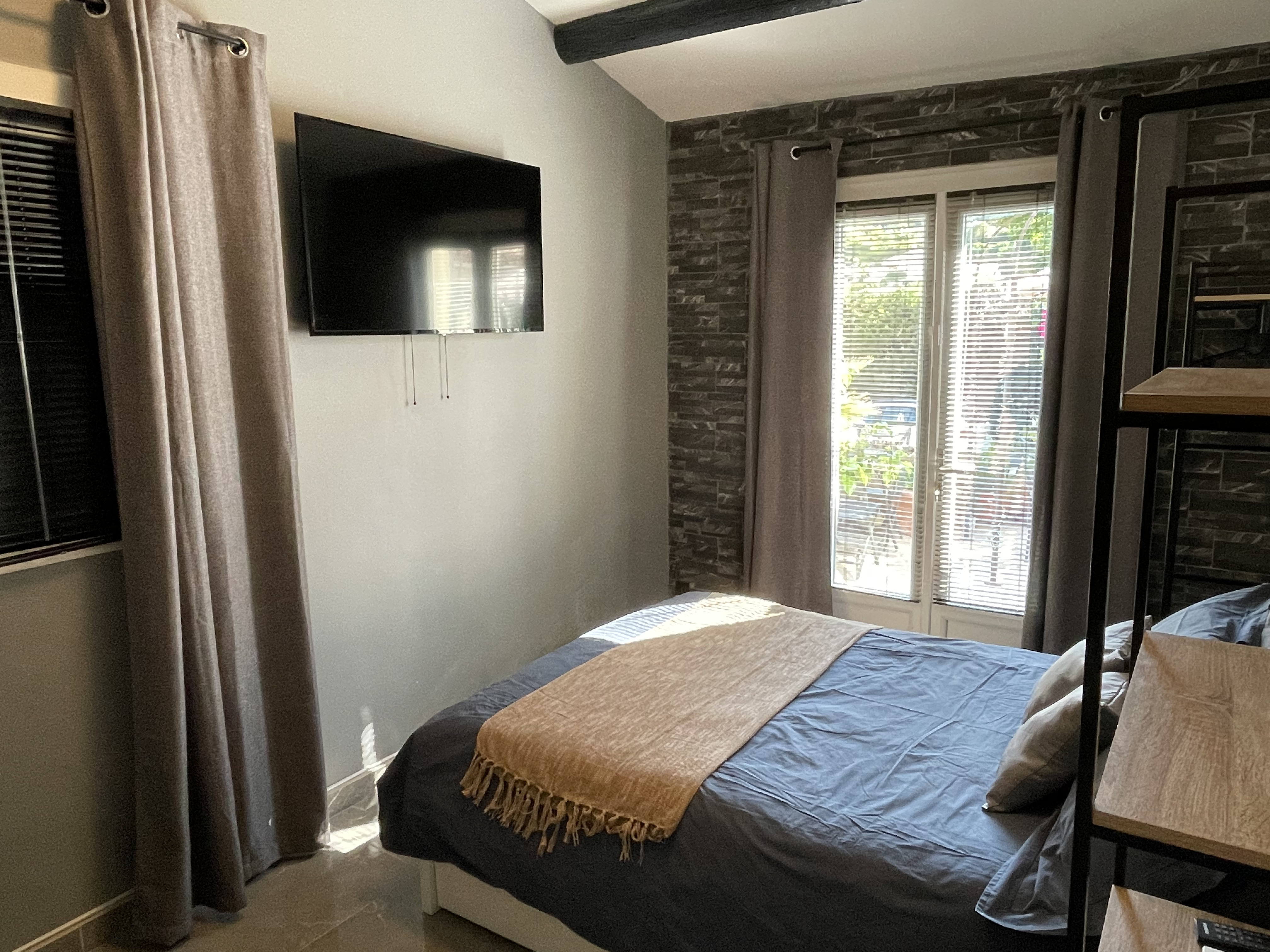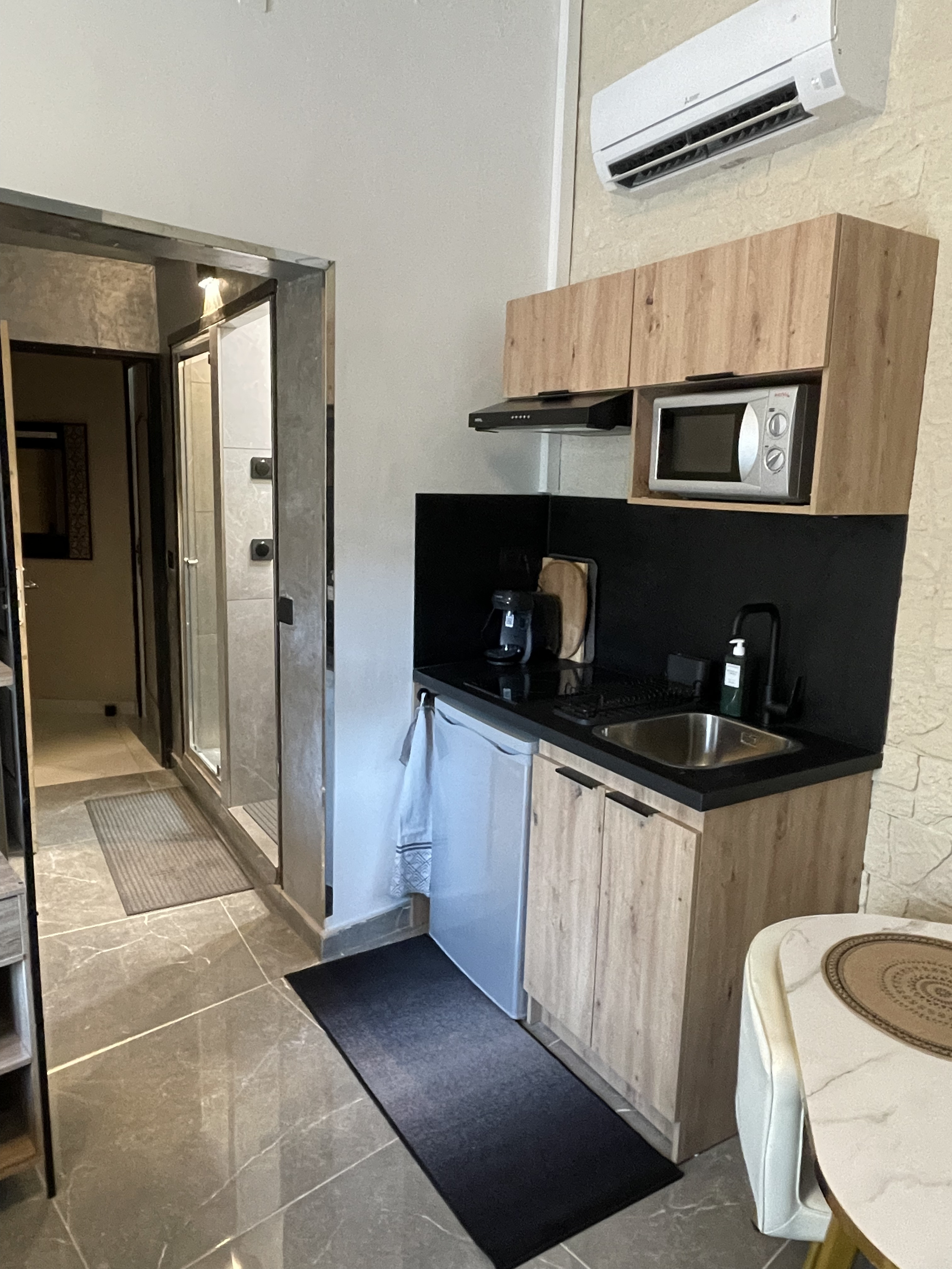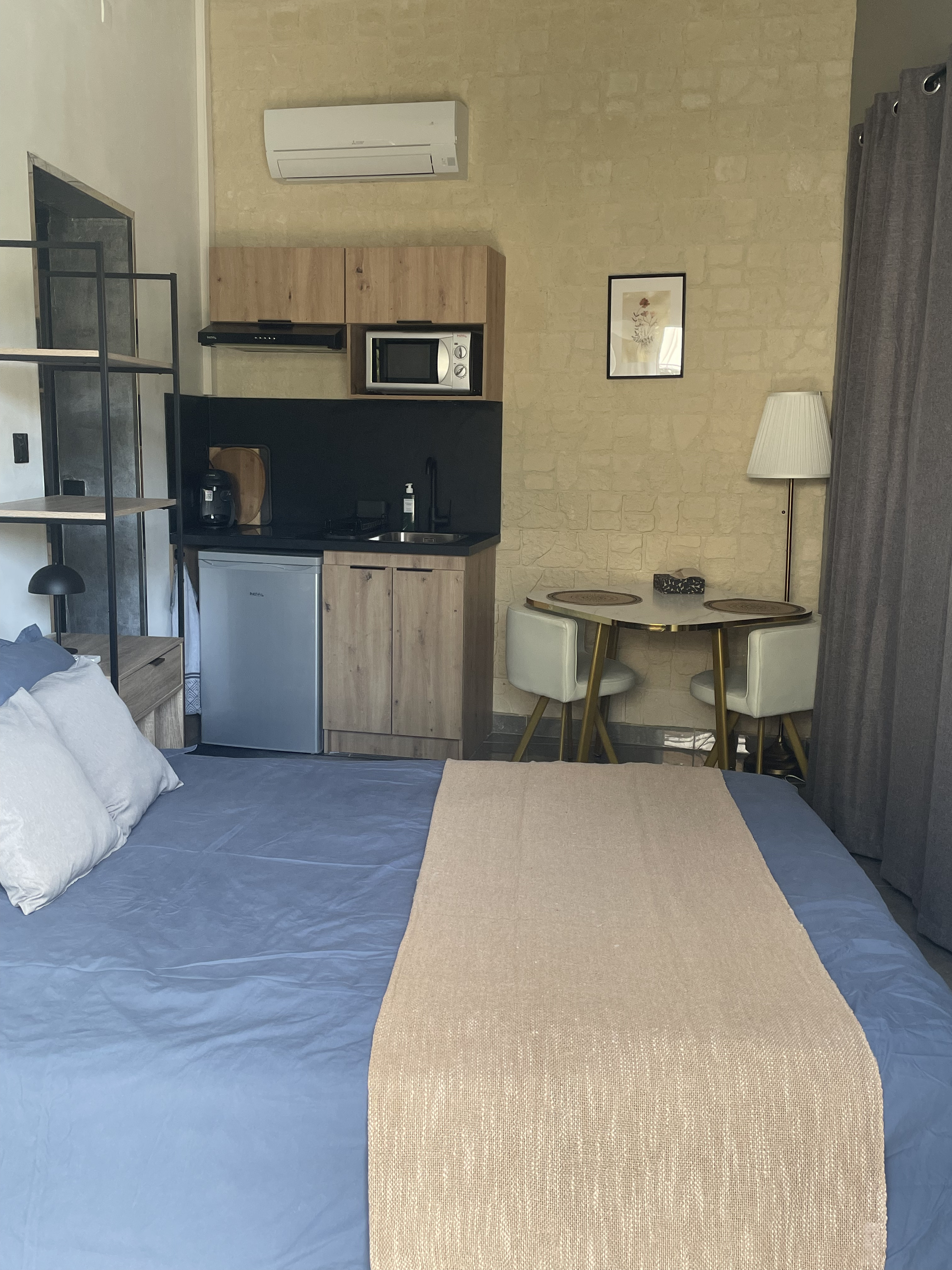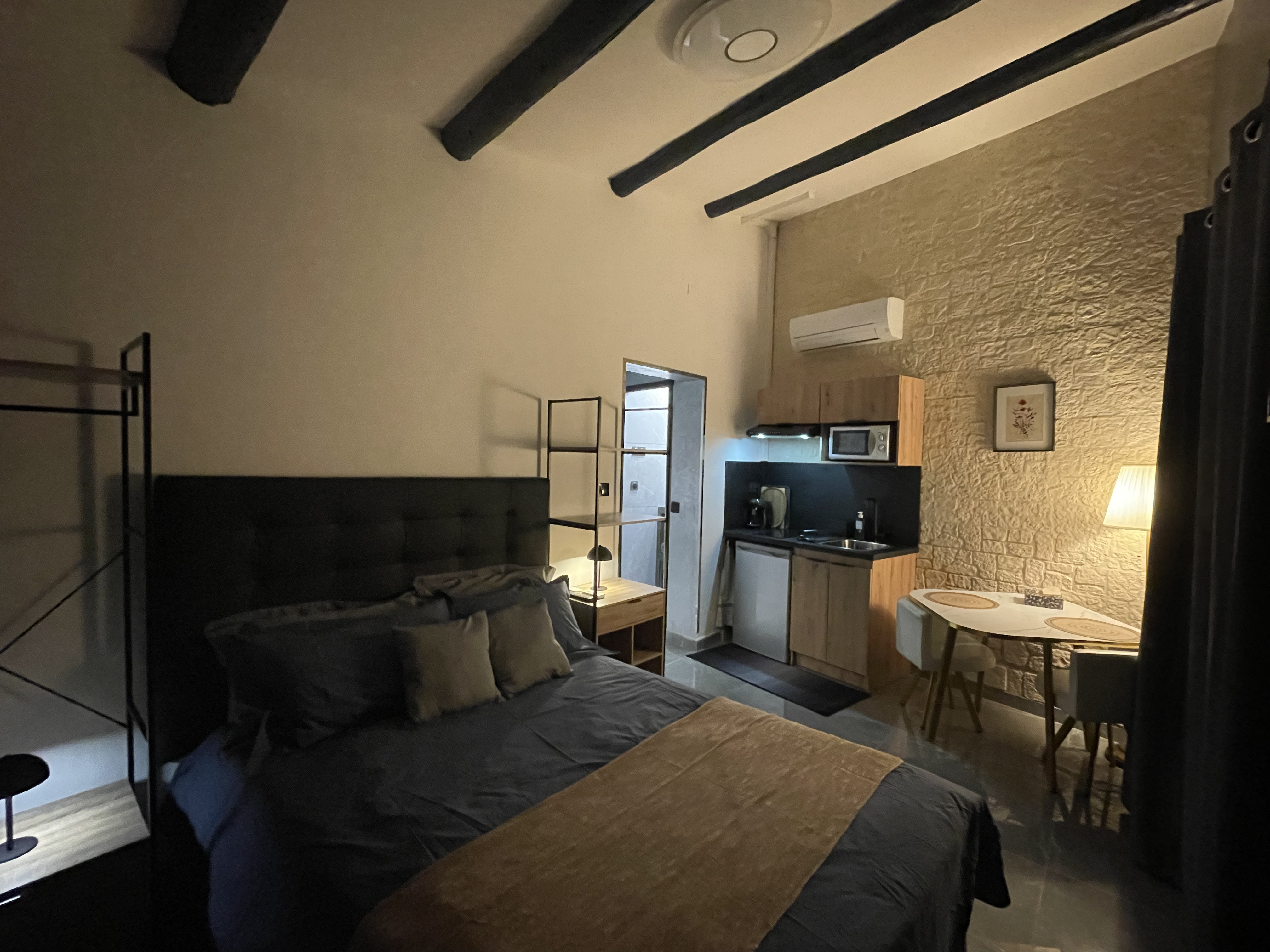 Conforts : Lit 140 cm - Réfrigérateur - Climatisation - Micro-ondes - Sèche cheveux - Douche - Plaque vitrocéramique - Couette - Hotte aspirante - Machine à café - Plaque à induction - Draps compris - Double vitrage - Télévision - Coin cuisine - Bouilloire - 1 salle de bain (privée) - Accès Internet privatif Wifi - Linge compris - Hébergement insonorisé - Non fumeur