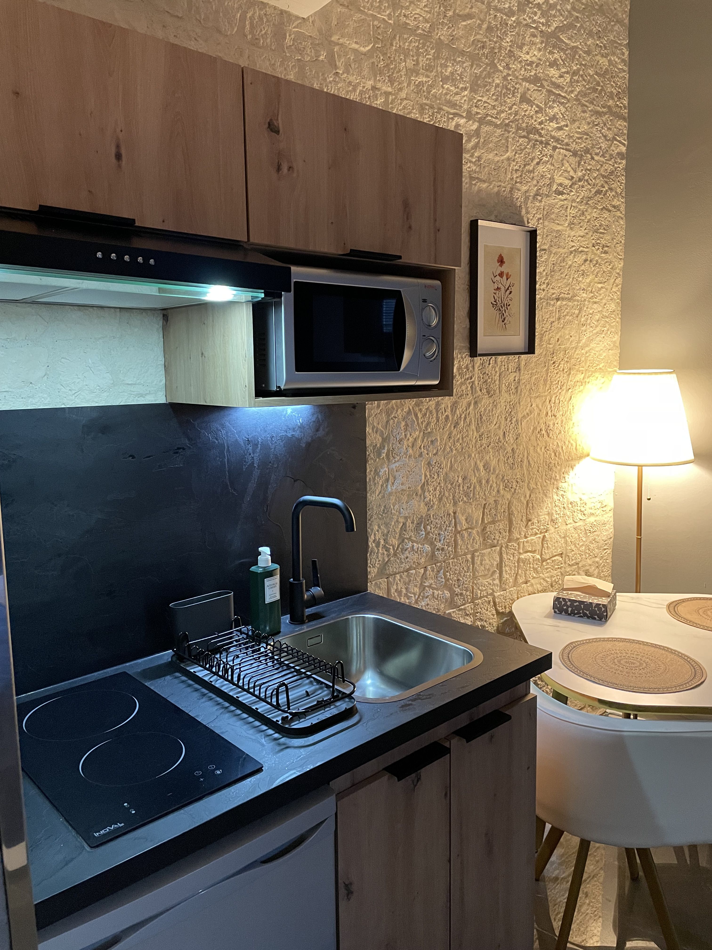 La kitchenette est entièrement équipée. Terrasse aménagée, accès à la piscine 12x8m, connexion Wifi, Smart TV, climatisation, espace télétravail.